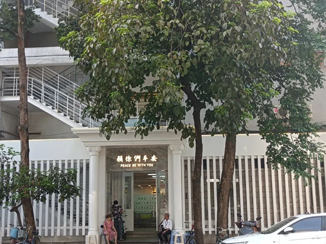 门口的两位老人面对面坐着,闪亮的标语告诉我们,要平安 。