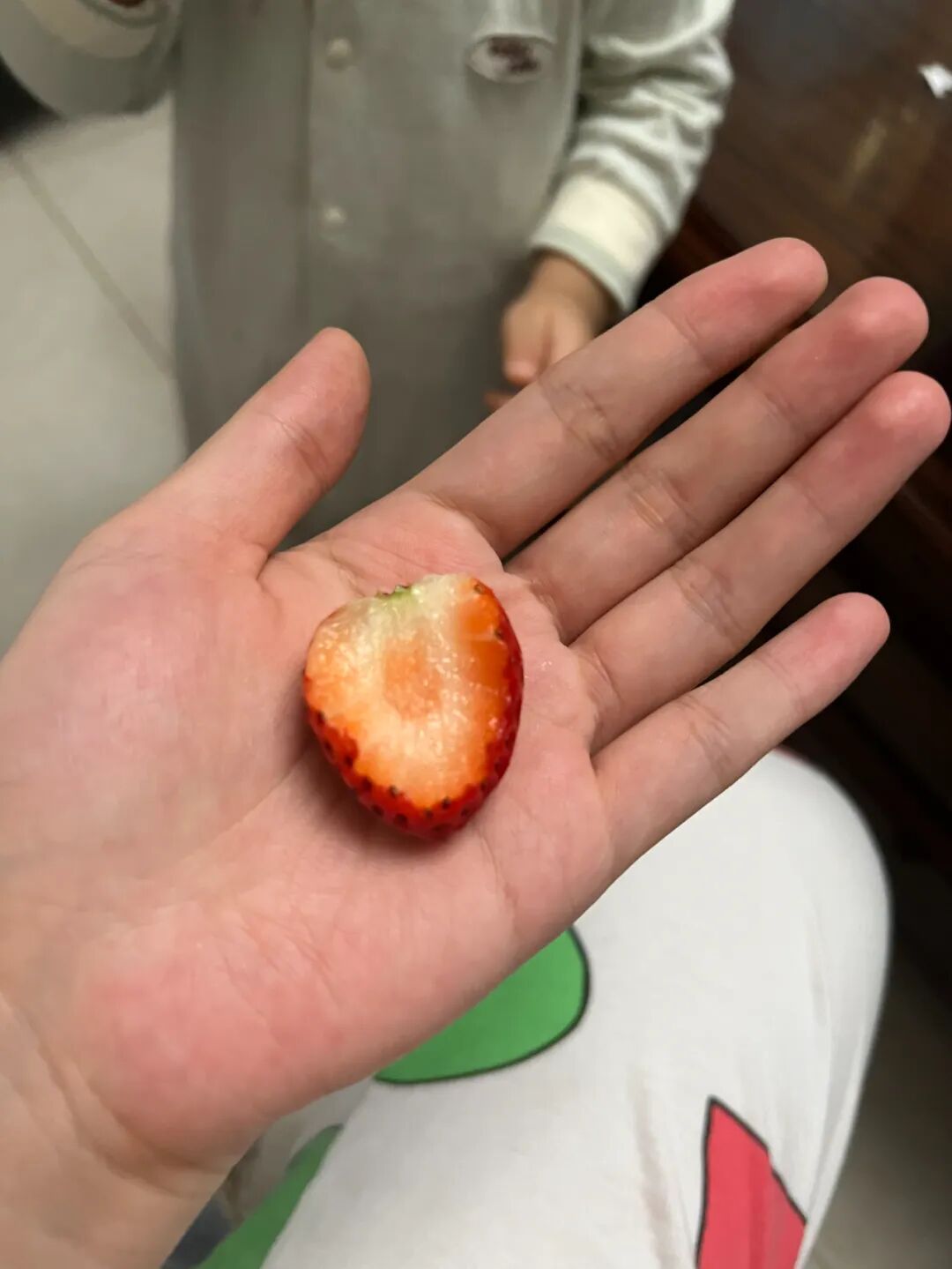 冬天的第一颗草莓,儿子吃了一半,给了我一半,感动得老母亲老泪纵横。后来发现,遇到不甜的草莓他就这样处理,甜的话就自己全吃了。哈哈哈真的「孝」到我了。