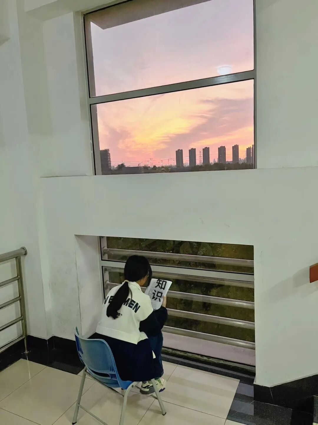 是和一群不太知道名字的考研的战友忙里偷闲看完了一整场日落,她们走的时候偷偷帮我记录了一张正在背书的照片。