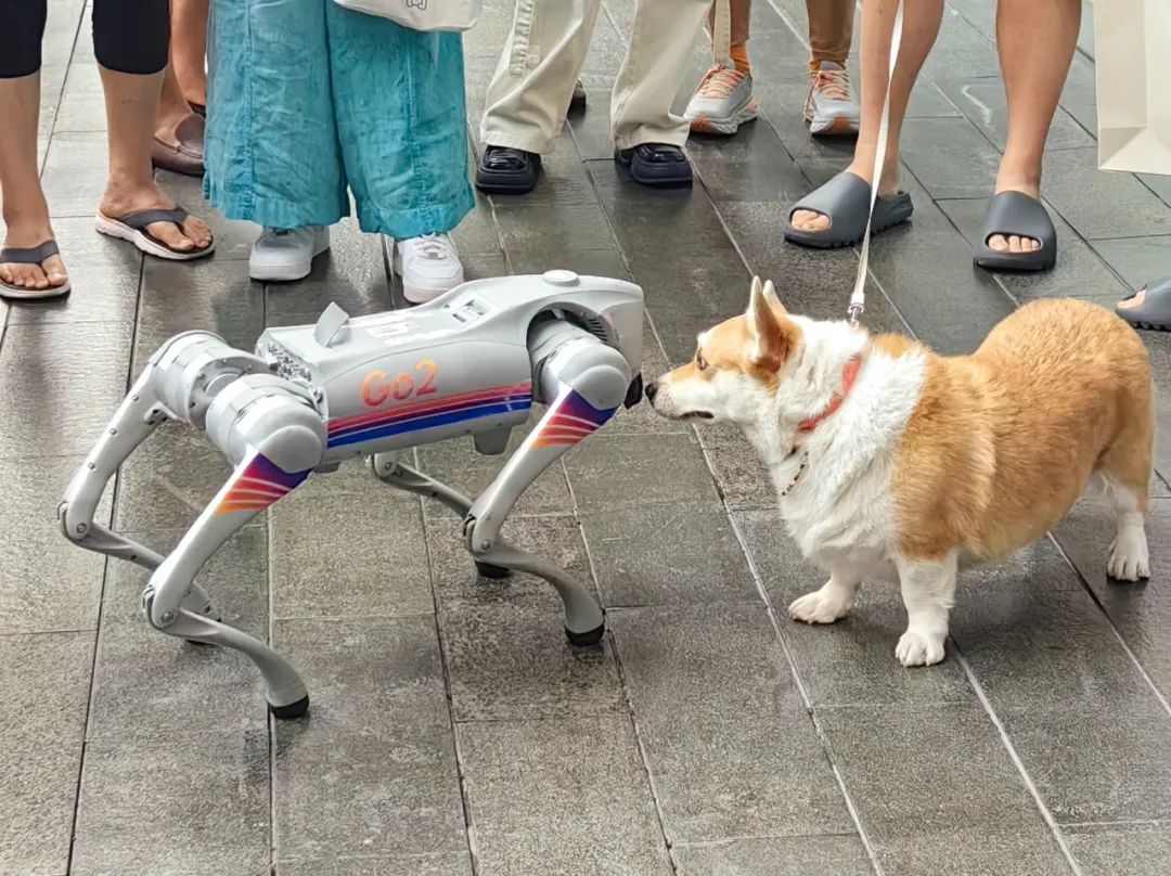 真·狗 vs 机器狗,一个神奇的瞬间,柯基一脸好奇惊恐,像是过去遇到了未来。