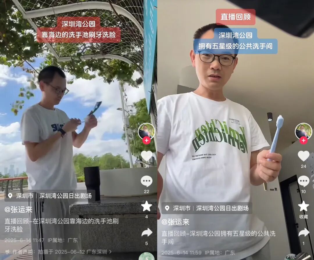 张运来在视频中演示如何在深圳湾公园的公共空间洗漱。