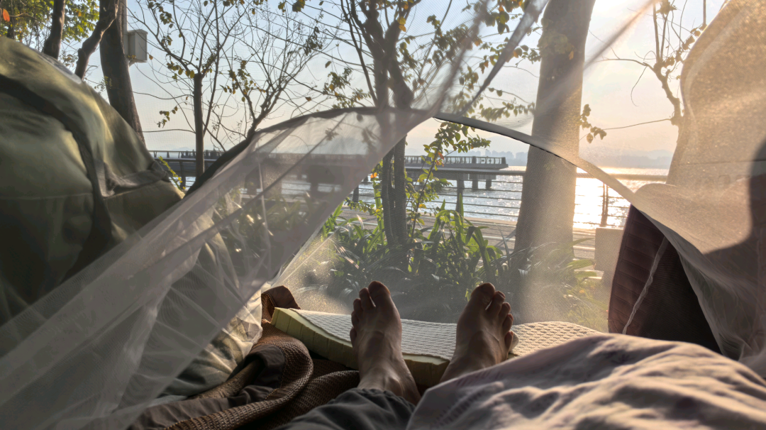 拥有一整个公园的感觉是很美好的。早上我起床之后,会拿着牙刷,穿过一片绿荫,吹着海风,走到公共洗手间洗漱。深圳湾公园的公共洗手间绝对是五星级的,特别干净,没有异味——在大自然里刷牙洗脸的感觉真的很美好。在这个时间里我经常想,这时候许多人可能正在挤地铁,或者堵在路上,而我此时正在悠闲地看海,这感觉很像露营度假,而我天天都在这样的状态里。