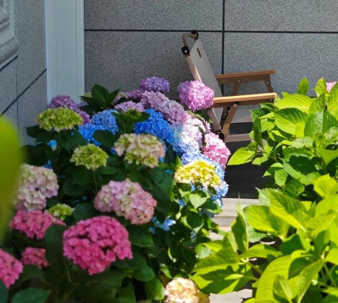 2年多前,我开始接触种植,在80平米的露台,种下柑橘、柠檬、蓝莓、水蜜桃等果树,还种下了月季、蔷薇、绣球等花卉。五月的露台,正是无尽夏盛开的时节,结束一天的工作,给孩子辅导完作业,我常将一张凳子放在无尽夏旁,闲暇时,拿起一本喜爱的书,坐在它的身边,有时摸摸花瓣,辨别花朵不同层次的颜色,有时看看柑橘叶被风吹动轻轻摇曳的样子,有时抬头看几只鸟站在屋檐叽叽喳喳对话,有时什么也不想。