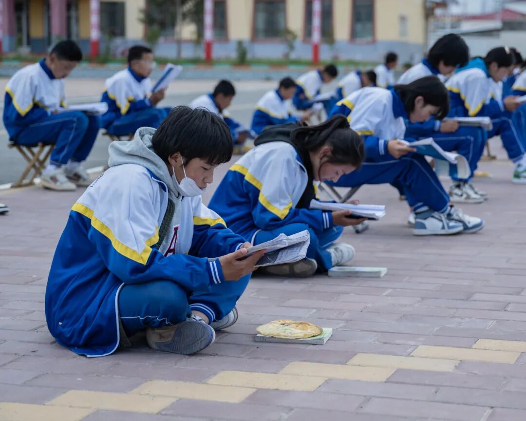 这张照片应该是晚上六点多,天还亮着,学生们都是寄宿制,活动课结束了,晚饭也吃完了,一整个操场都是坐在那儿看书的孩子,我突然发现有个孩子给自己弄了一个馕,可能是宵夜,挺有意思的,就拍下来了。