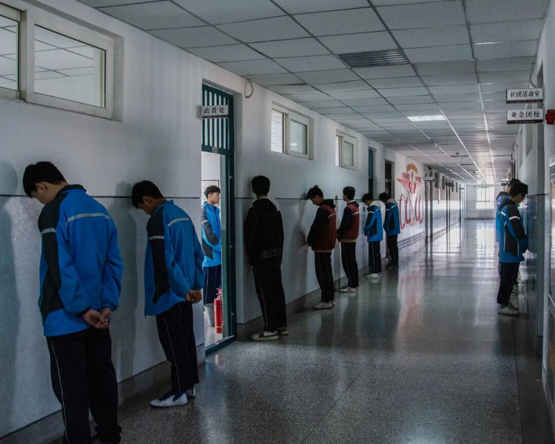 后来我了解到,那天是学生之间发生了一些冲突,一共有十几个孩子参与,很容易出事,正在楼道里反省。外面站不下了,里面还站了两个,其中一个正好能从门缝看到,我就赶紧去拿相机出来。门口黑衣服的那个家伙发现我了,哈哈,还特意把脸转过去了。