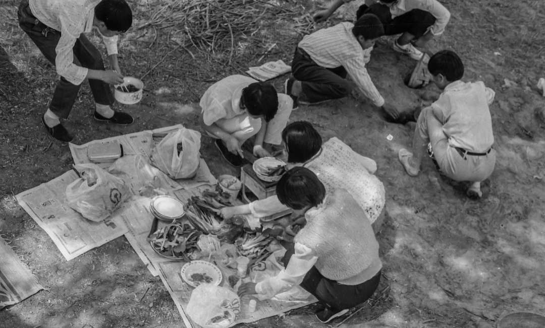 那个年代铁路学校还是比较好的,因为铁路工资比较高,所以孩子们的家庭条件稍微好一点。这张照片是当时学校组织去野炊,塑料袋上都是中国铁路的标志。那时的野炊也不像现在,是真的野炊,锅碗瓢盆都带,还有家里做饭的锅和案板,一起弄点洋芋啥的。