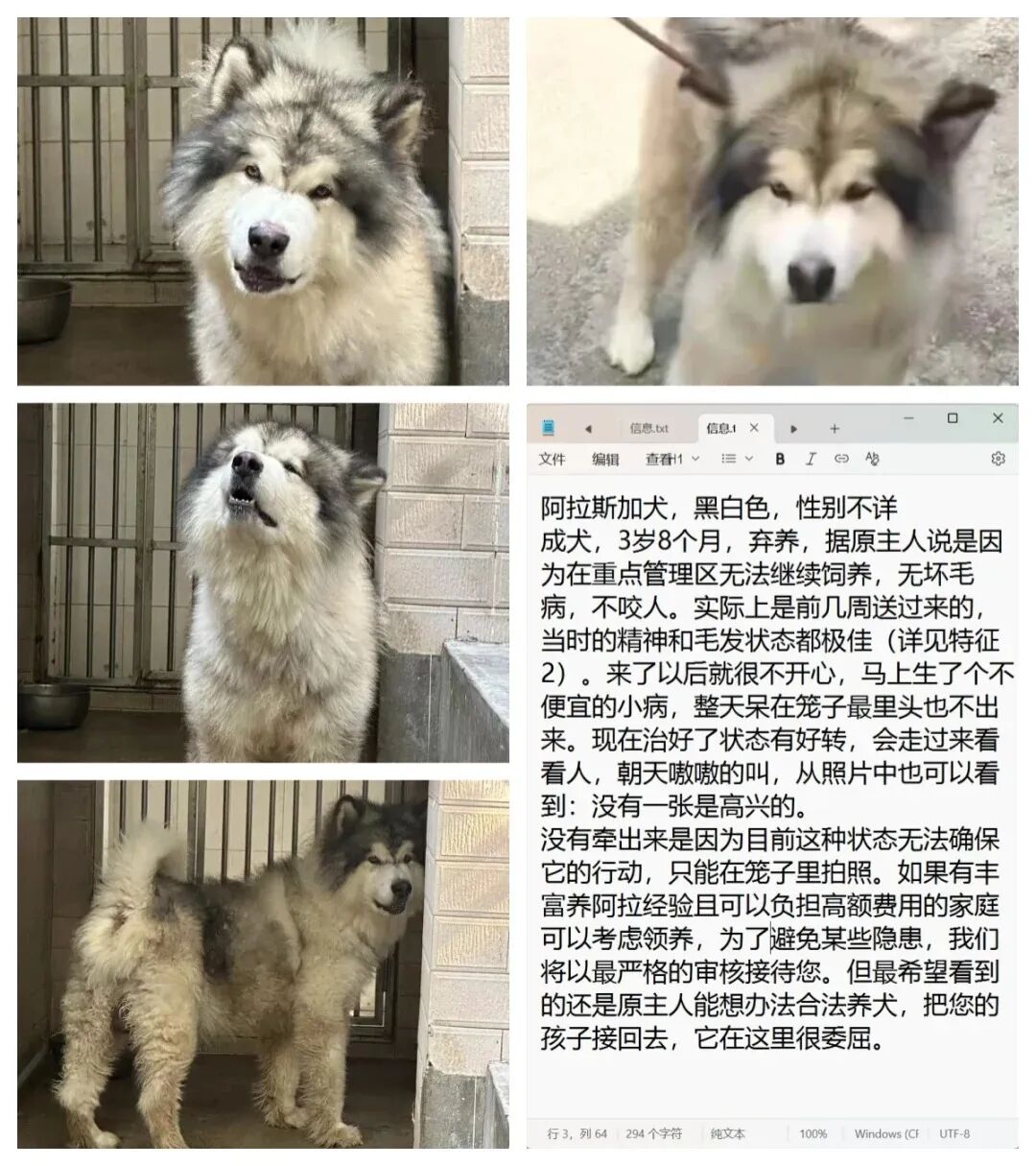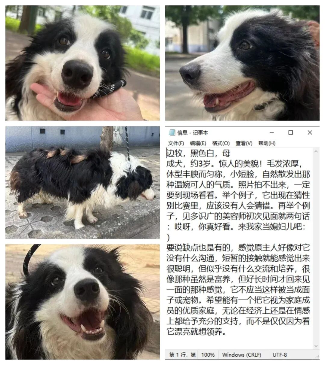 在文案中,我会着重描述狗的内在,也就是它的性格和精神状态。我见过那种小狗,见人就激动叫唤,套上绳就一直挣扎,这种一看就是之前饲养环境出了大问题,才形成了这么拧巴的性格。还有说一两次就能听懂口令的,但一到要回笼子的时候就不愿意。但它也不会呲牙翻脸,最后也是好好在笼子里呆着。这种是非常聪明的狗,也很渴望互动和沟通,如果回不到原来的家,那也希望能介绍给喜欢和狗狗大量互动的人领养,满足双方的情感诉求。为狗匹配到合适的主人,这也是极其重要的事情,大家都开心才好。