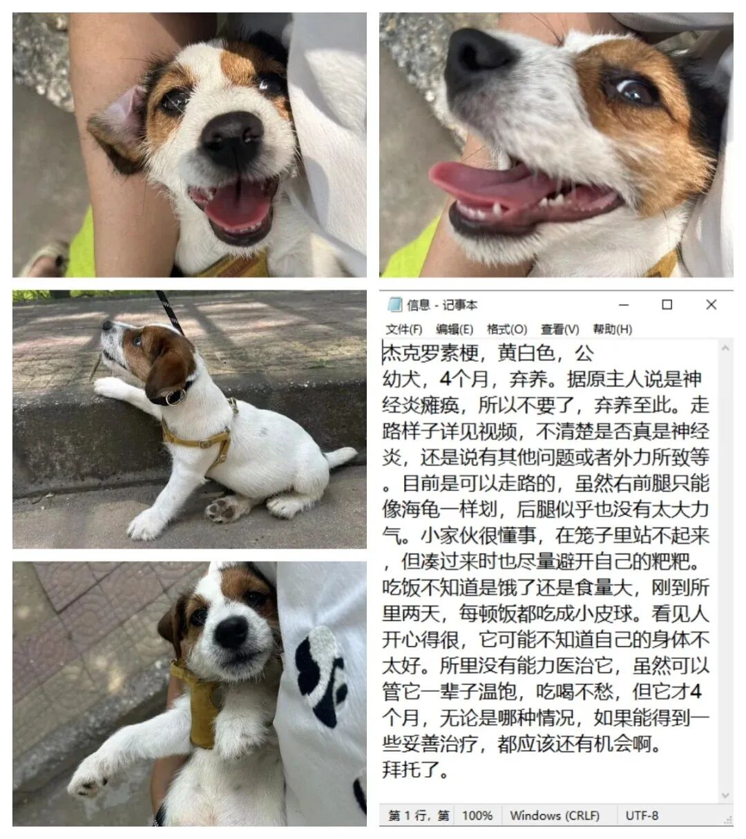 今年6月,留检所来了一只4个月大的杰克罗素梗,据原主人说是神经炎瘫痪,所以弃养在了这里。我看到的时候,它还可以走路,但右前腿只能像海龟一样划,后腿似乎也没太大力气。刚到所里的时候,不知道是饿了还是食量大,每顿都把自己吃成小皮球。它平时也跟普通的小奶狗一样,对所有人充满好奇,除了吃睡玩,就是吃睡玩,看见人就开心得很。我猜,它应该是不知道自己的身体不太好。所里没能力医治它,但肯定是吃喝不愁,不管这辈子是长是短,留检所管定了。