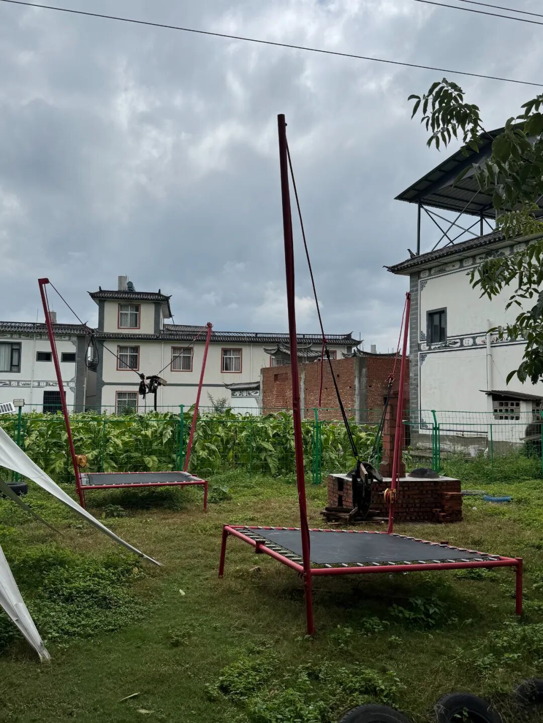 院子对面的绿地,也被租下来改造成一片户外活动区,有蹦床,粗糙的原木制成的跷跷板,平衡木桩、攀爬架,和一个小型吊桥。