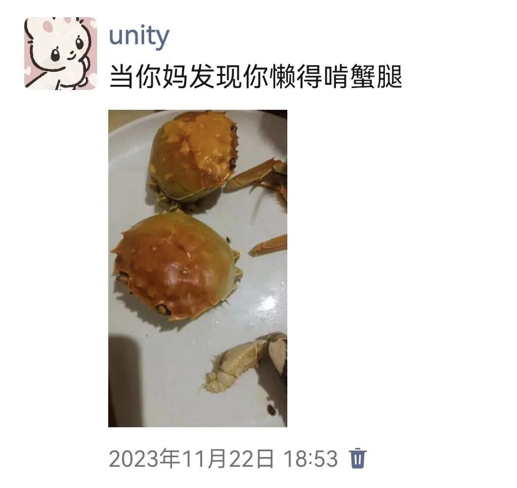 我的家乡不临海也没湖泊,这是我第一次吃螃蟹,是我爸爸带回来的,我们一家三口吃得很开心。那段时间我因为工作压力大刚刚离职,终于可以停下来好好吃饭慢慢拆一只螃蟹,没有DDL、没有职场PUA、没有突然到来的检查和通知,不会紧张到胃痉挛,也不会焦虑到失眠。