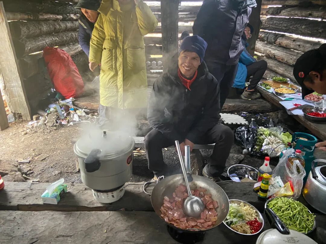 当天走完16公里,人已经累瘫了,一天没吃饭,就等着领队亲自炒一点热乎菜。看着领队洗菜、切菜、倒油、开炒,肉由生变熟,滋滋冒油,青椒也开始出现了虎皮,加上被油溅过的蒜香,无比美好。