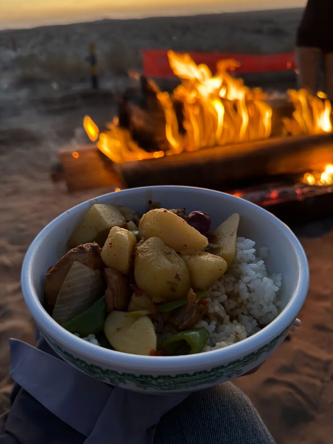 去年离职之后去腾格里沙漠种了半个月的树,因为在西北,所以吃的多是面条。但有一天晚上种完树回去发现居然做了米饭,当时太开心了(因为我是南方人,而且那时候真的太久没吃白米饭了),当时端着米饭坐在火堆前面看着夕阳,和同行的小伙伴快乐地大喊:「我吃上米饭了!」