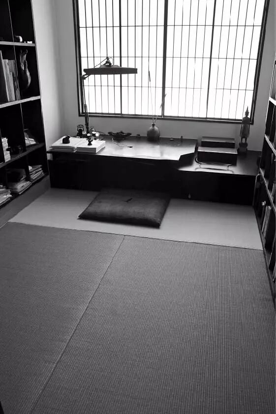 在现在的家里,原研哉最喜欢的地方是书房。那是一个榻榻米房间,因为他经常需要写东西,所以书房设计目标就是实现各种各样姿势的写作——坐着写,趴着写,写累了向后一仰,躺在榻榻米上歇会儿,爬起来还能继续写。书房有三面书架,包围着书桌,在小小的房间里,坐着一伸手就能拿到书。窗前是糊着和纸的障子窗,再刺眼的阳光透进来也如同月光一样柔和。