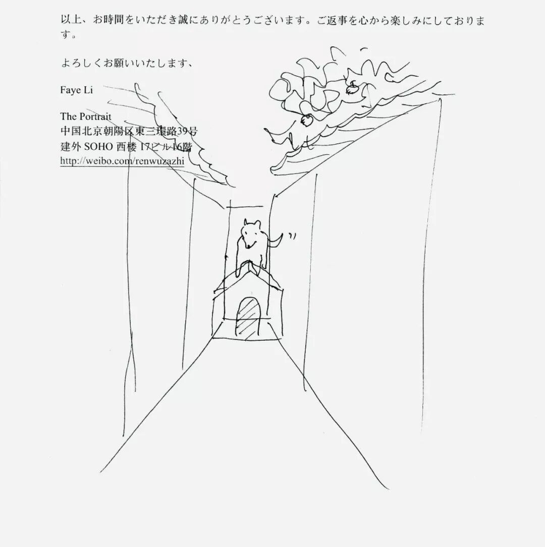 这种「创作自己的生活」的尝试,让活着的感受完全变了一副模样。几十年过去了,已经是满头白发的原研哉还能够清晰描述出小时候的家。那并不是富裕的生活,但在记者的采访提纲上,他还饶有兴致地把「幸福」画了出来,「一只小狗会一直站在小屋顶上,摇着尾巴」,隔了一会儿,他取回稿纸,对「幸福」进行了补充——那个狭窄的巷子尽头,在记忆里也不再像个闭塞的死胡同,光线非常好,抬头看到的天十分开阔,一边是郁郁葱葱的柿子树,结满了沉甸甸的果实,另一边是一望无际的白云,湛蓝色的天。