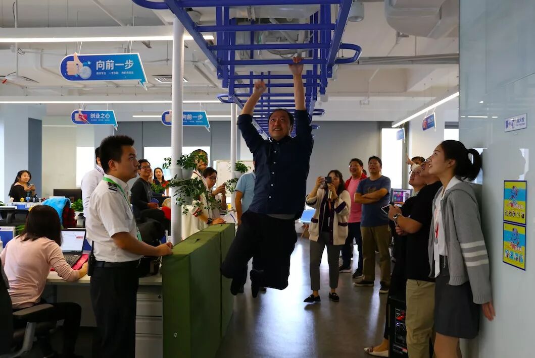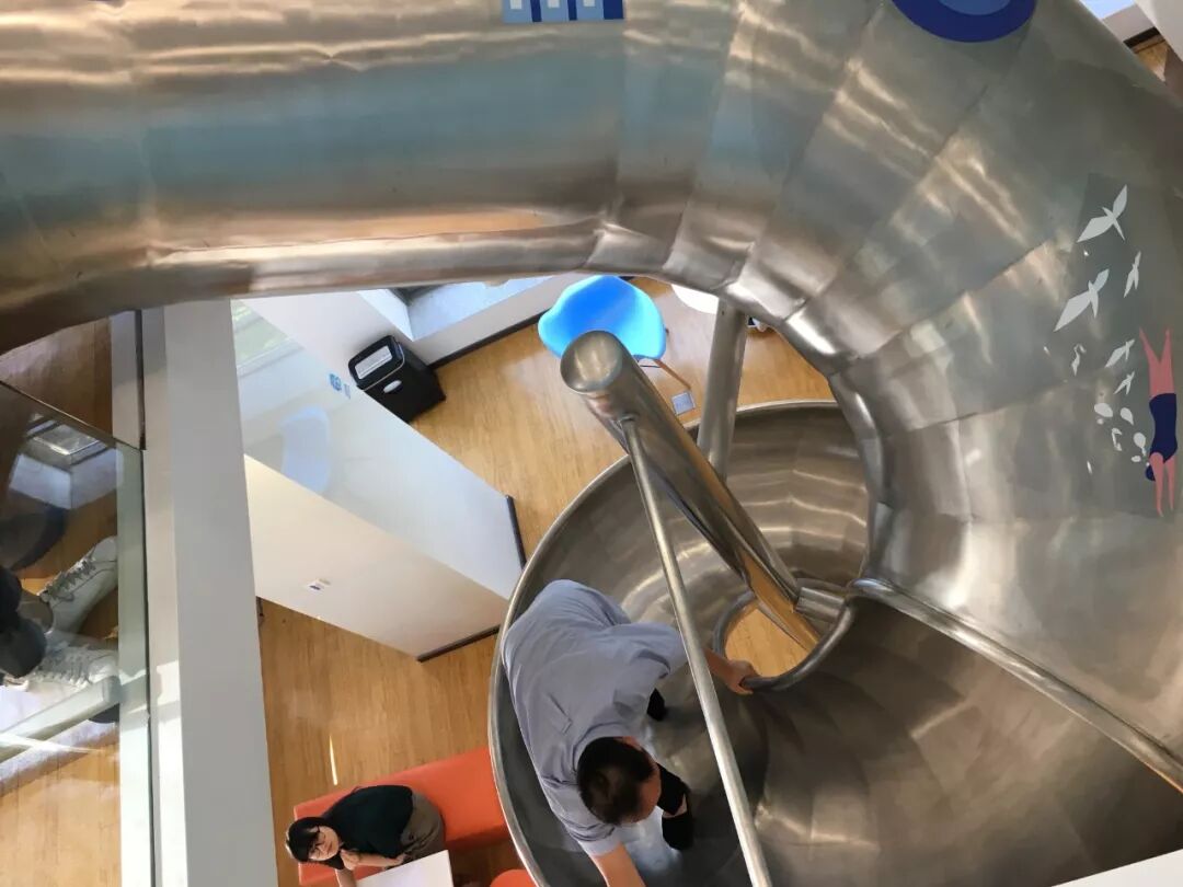 这群人擅长苦中作乐。在新办公楼七楼到八楼之间有一条铁皮滑梯,当《人物》记者问起这条滑梯时,无招突然蹭地一下站了起来,「我喜欢做一件事情是说不要走寻常路,我带你玩个有意思的。」他趿着拖鞋,穿过长长的走道,浅蓝色的短袖衬衫没有像商务人士那样塞进裤子,飘飘地荡了起来。到了滑梯处,他脱了鞋,嗖地滑了下去,然后穿着袜子开始往上爬,爬了两次才成功。原本安静的办公楼一下变得热闹起来,大伙嗨了,一个个也开始滑了起来。