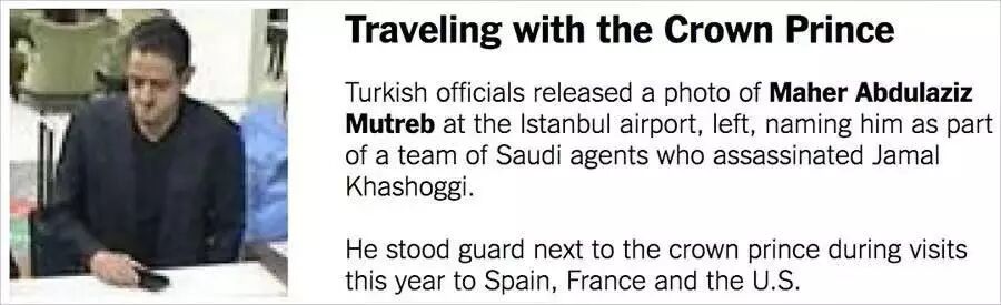 杀人的全过程被录音设备记录了下来,被土耳其官员透露给了当地媒体,世界舆论大哗。之后,美国媒体用了各种技术和手段,确认了15个人的身份,他们来自沙特的安全部门、军队以及其他政府部门。这些背景表明这是一场来自国家机器的大张旗鼓的围捕,最大的嫌疑指向这些人围绕运转的核心——目前在沙特大权在握的王储穆罕默德•本•萨勒曼,15人名单里有一人曾多次跟随他出行,被认为是其贴身警卫。「王储对安全部门的完全控制,使得在他不知情情况下进行行动的可能性微乎其微。」有美国官员告诉媒体。