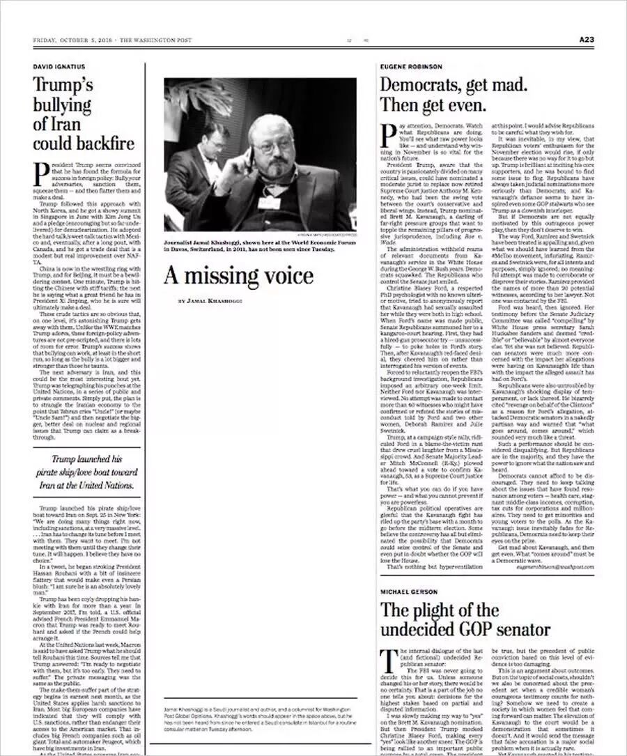 卡舒吉遇害后,《华盛顿邮报》的编辑凯伦•阿提亚在卡舒吉的版面上留了一片空白,题目是《一个消失的声音》