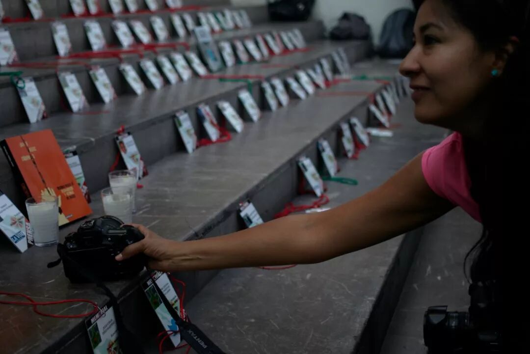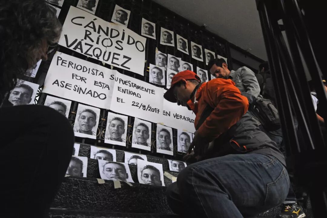 墨西哥民众在市政厅前摆放被杀记者照片,抗议记者频繁被杀害