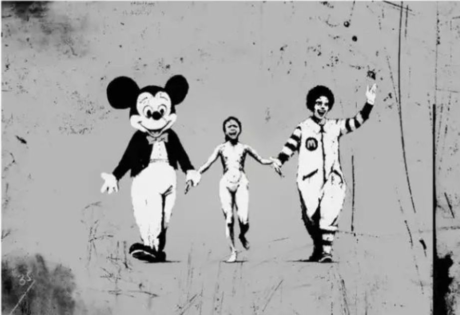 代表着美国霸权的米老鼠和麦当劳牵着小孩,而小孩是越南战争的受害者图/网络