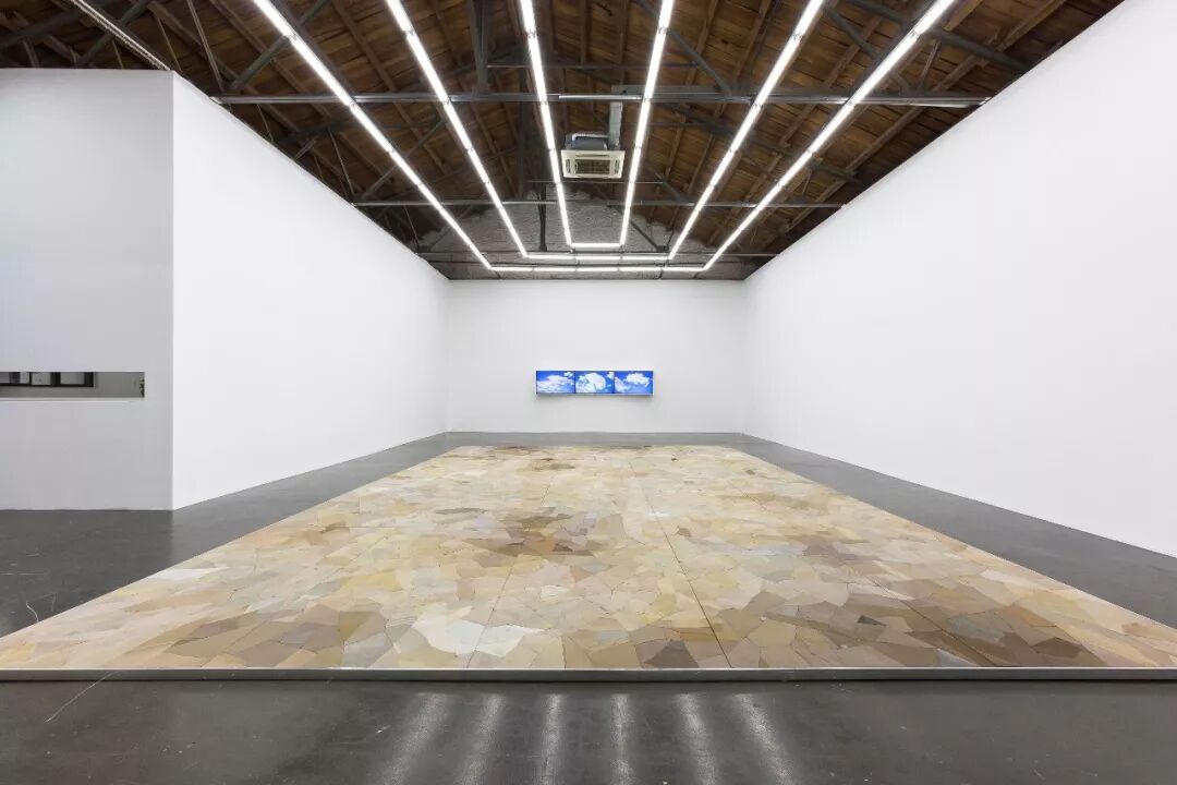 这些变化,体现在她2017年的作品里。一块半个篮球场大的水泥地板上,远看像梯田一样错落着深浅色块,近看是各式各样80年代的半透明尼龙袜,微小之处,可见一些指甲盖大小的破洞,和拉成缕的挂丝,像琥珀一样,从那个年代移植而来。