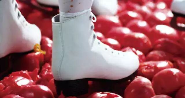 她早期的作品里都延续着类似的强表达欲,纤细敏感中带着刺。她拍一群15岁的高中女生,额头上的青春痘呼之欲出,脚下套着冰刀鞋,踩在装满鲜嫩西红柿的大池子里,果肉一颗颗噼啪裂开,汁水四溢,她命名为《彩虹》。在她眼里,青春如彩虹般易逝,同时也是破坏性的、荷尔蒙喷薄的。她也常出现在自己作品里,顶着一张青春恣意的脸,在名为《牛奶》的作品里,她穿着裙子躺在地上,雪白的牛奶在她的裙下、手边流着。打破牛奶营养洁净的形象,她把牛奶化作青春蓬勃欲望的载体。